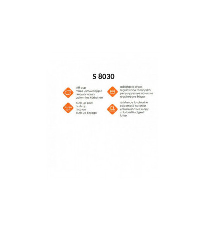 Vientisas maudymosi kostiumas - viršutinė linija raštuota - vientisa nugara - kaušeliai paminkštinti, šiek tiek raukšlėti - reguliuojamos petnešėlės, nuimamos tik priekyje - pamušalas priekyje